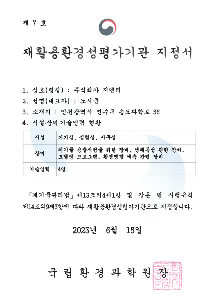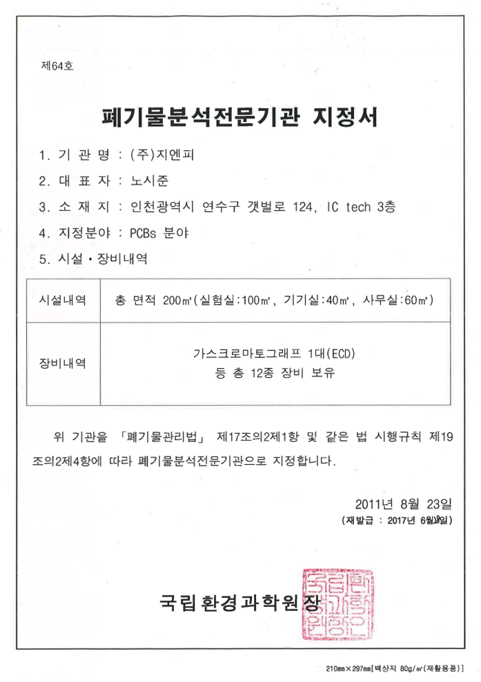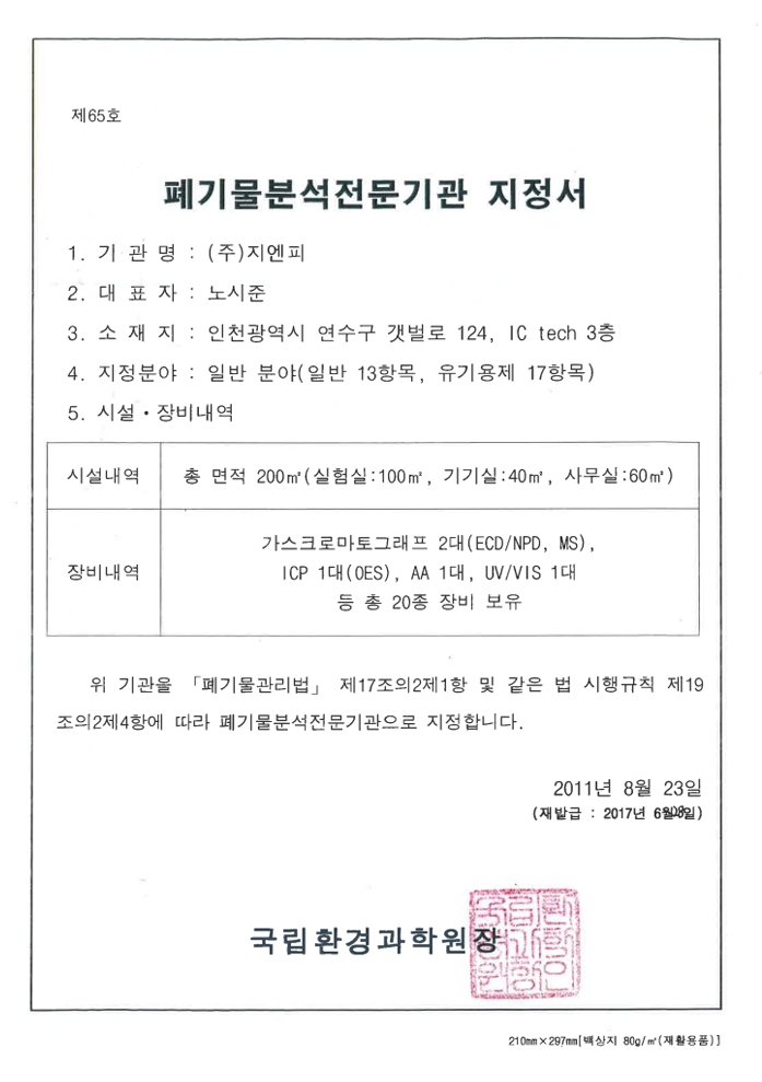 폐기물분석전문기관지정서(일반분야)