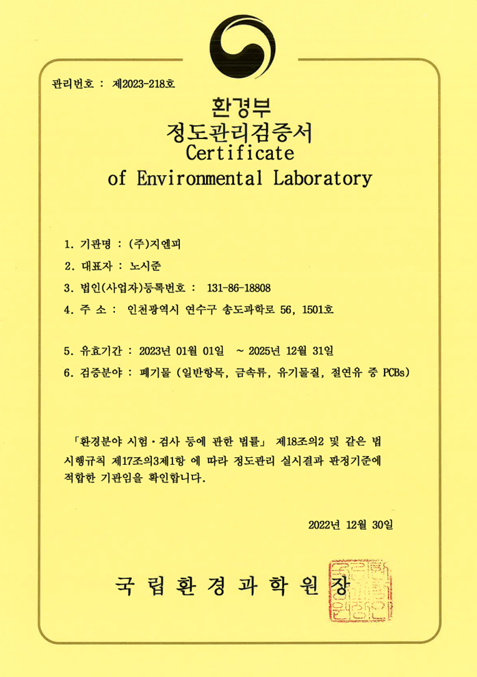 폐기물분석전문기관지정서(PCBs)
